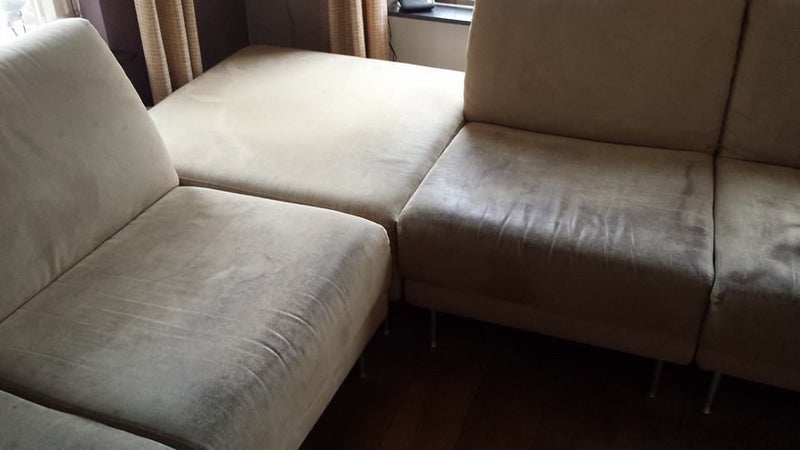 Een mooie simpele hoekbank waar flink op geleefd zoals het hoort natuurlijk, de kinderen en katten hebben er een hele boel vlekken achter gelaten, mevrouw heeft met verschillende vlekkenreinigers de vlekken geprobeerd te verwijderen maar zonder resultaat.